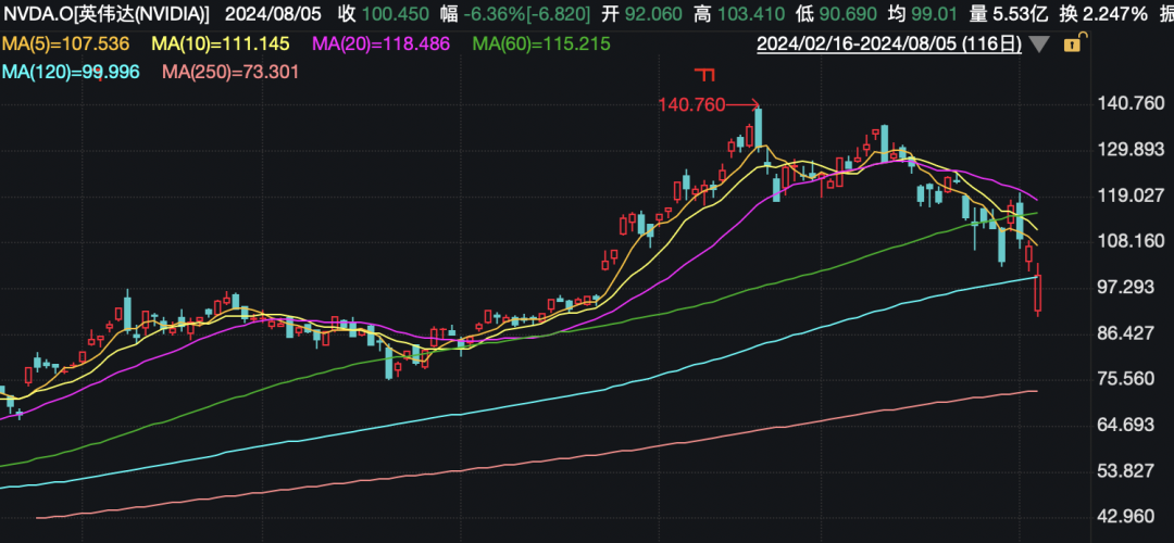 英伟达股价曾在6月18日创下历史收盘新高——135.58美元/股,次一交易日,英伟达股价盘中再创140.76美元/股的新高,但收盘股价下跌超3%。随后,英伟达股价开启先跌后涨,在7月10日收盘又上逼135美元创下第二高纪录,此后便一路下滑。周一,英伟达股价再次下跌6.36%,目前股价已从历史高点累计回撤了28.6%。分析认为,英伟达近期的暴跌主要是受一些外部因素的拖累,包括美国意外疲软的就业数据、其他公司低于预期的业绩、季节性的市场逆风以及日元套息交易平仓的打击。