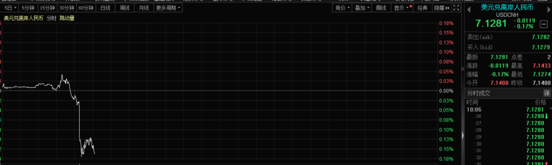 今天早上,人民币中间价升至7.10元强方,为去年11月来首次。人民币兑美元中间价报7.0995,上调26点;上一交易日中间价7.1021,上一交易日官方收盘价7.1411。随后,离岸人民币直线拉升。