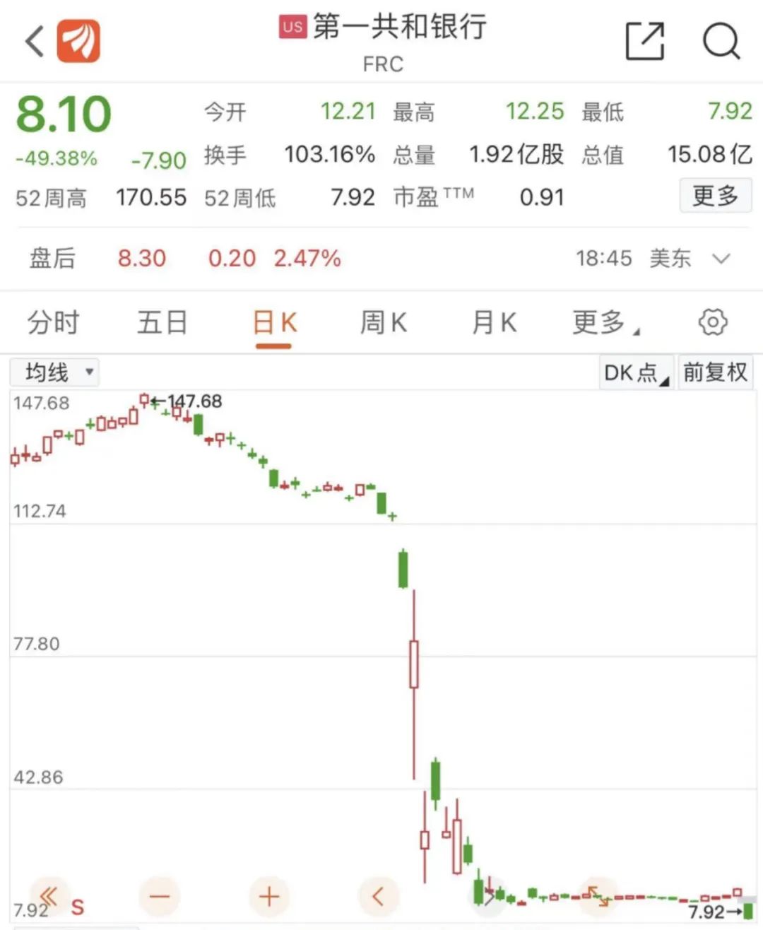 受此消息影响,隔夜美股开盘后,第一共和银行遭受市场猛烈抛售,截至收盘,股价暴跌近50%,使得其年内累计跌幅扩大至93%。
