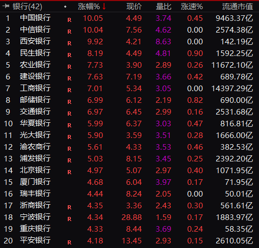 就在刚才,中信银行、中国银行、西安银行强势涨停,工商银行、农业银行涨幅皆超7%。而这已经不是近期银行股第一次“暴动”了。受银行股带动,整个中字头板块亦表现十分出色,上证指数更是上涨超50个点。在A股历史上,这种行情是极为罕见的。那么,究竟发生了什么?