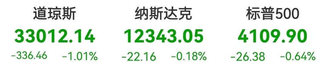 当地时间5月16日,美股三大指数集体收跌。道指跌336.46点,跌幅为1.01%,报33012.14点;纳指跌22.16点,跌幅为0.18%,报12343.05点;标普500指数跌26.38点,跌幅为0.64%,报4109.90点。