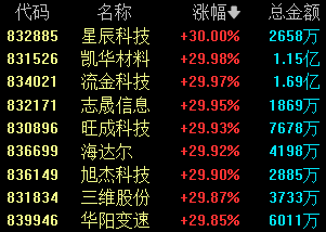 北交所231只个股全部上涨。其中,星辰科技、志晟信息、海达尔、旭杰科技、华阳变速等9只个股迎来30%涨停。